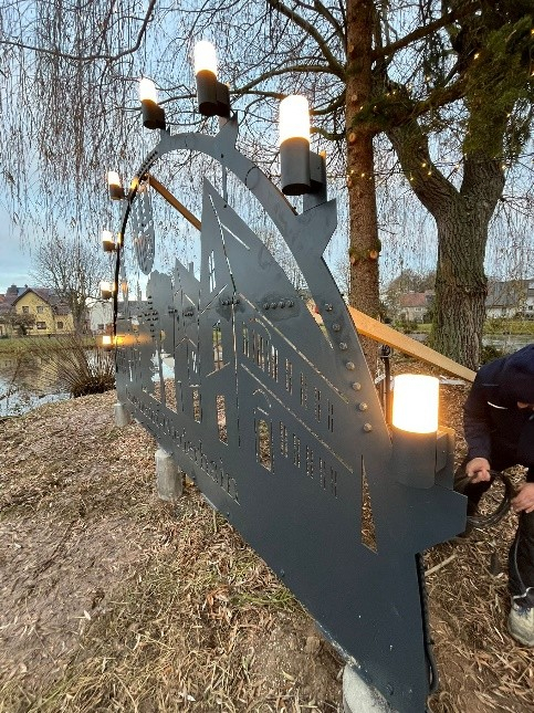 Lars Heimer erklärte sich schließlich bereit, sich der Sache anzunehmen. Ganz einfach war es nicht: Ein passendes Motiv musste gefunden, eine Firma gesucht werden, die diese Vorstellung genau umsetzt, und natürlich musste die Finanzierung gesichert werden. Lars nutzte seine Kontakte und traf bei Marko Bunn auf offene Ohren. Die Firma WMA erklärte sich bereit, einen so großen Schwibbogen anzufertigen – und so konnte das Projekt schließlich in Auftrag gegeben werden. Schritt für Schritt nahm nun alles Form an. Im Oktober konnte der fertige Schwibbogen schließlich abgeholt werden.